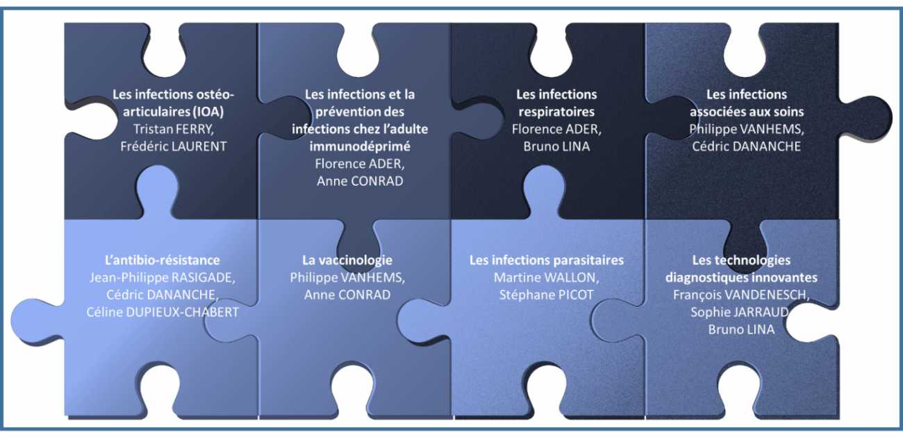Ainsi, le champ d’actions de la recherche clinique et translationnelle de l’axe IMEP est par nature transversal et multidisciplinaire. Les principaux acteurs en sont les équipes cliniques de maladies infectieuses, les équipes de l’Institut des Agents Infectieux (IAI) regroupant l’ensemble des laboratoires de microbiologie sur le même site que le SMIT, et le service d’hygiène, épidémiologie, infectiovigilance et prévention (SHEIP) réparti de manière multi-sites sur les HCL. La majorité des investigateurs appartiennent à des équipes de recherche du Centre International de Recherche en Infectiologie (CIRI - INSERM U1111, CNRS UMR5308, Université de Lyon, ENS Lyon). Par ailleurs, plusieurs cliniciens d’autres axes de recherche, de spécialités comme la réanimation, la chirurgie orthopédique, l’hématologie, l’oncologie, l’hépato-gastroentérologie, la pédiatrie, la cardiologie, et d’autres sont régulièrement associés aux travaux de l’axe IMEP.