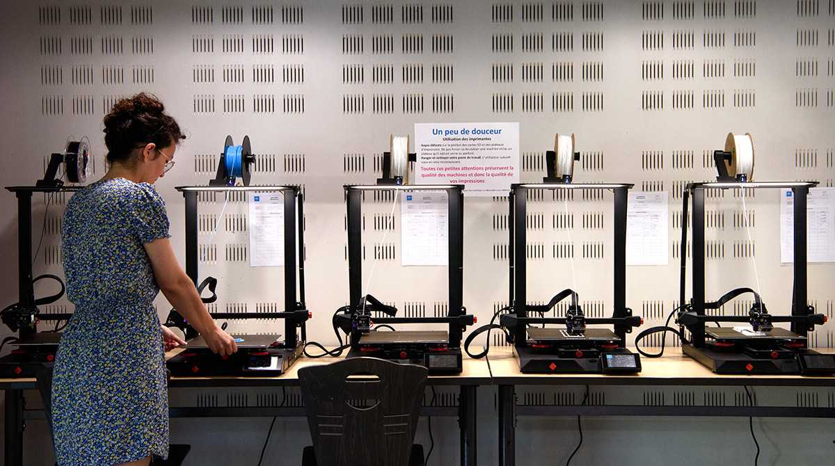 Cette plateforme de fabrication additive est née d'un partenariat avec l'Insa Lyon à l'issue de la première vague Covid. Aujourd’hui, ses 23 imprimantes sont installées au rez-de-chaussée d’un bâtiment du site de Lacassagne, dans un ancien restaurant-self transformé en atelier géant, où l’on croise toutes sortes d’objets en plastique coloré — une oreille, des médicaments, un clitoris, un crâne… — et des bureaux-établis accueillant des pinces, des bobines de fils chamarrés, des gants, un mini-chalumeau, une brosse à dents ou encore des blocs-notes griffonnés de formules étranges.