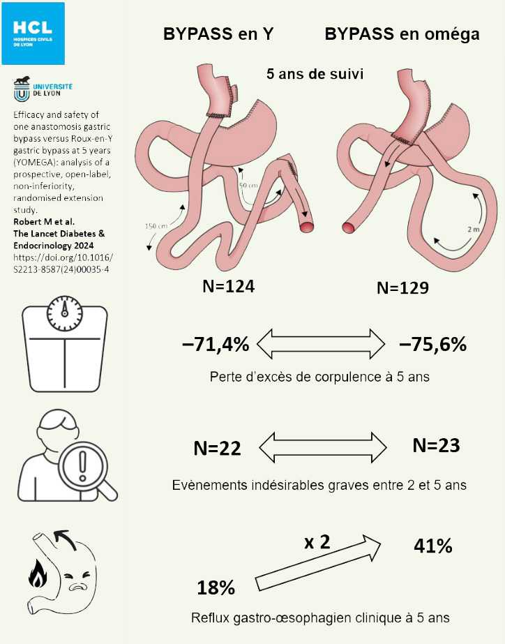 Les résultats à court terme (2 ans) de cette étude, publiés dans la revue The Lancet en 2019, ont montré une efficacité pondérale similaire entre les deux techniques opératoires mais un risque majoré d’événements indésirables graves, principalement de nature nutritionnelle, pour la technique du Bypass en oméga. Ces résultats ont contribué à la prise de position de la Haute Autorité de Santé (HAS) de dé-rembourser cette technique opératoire actuellement.