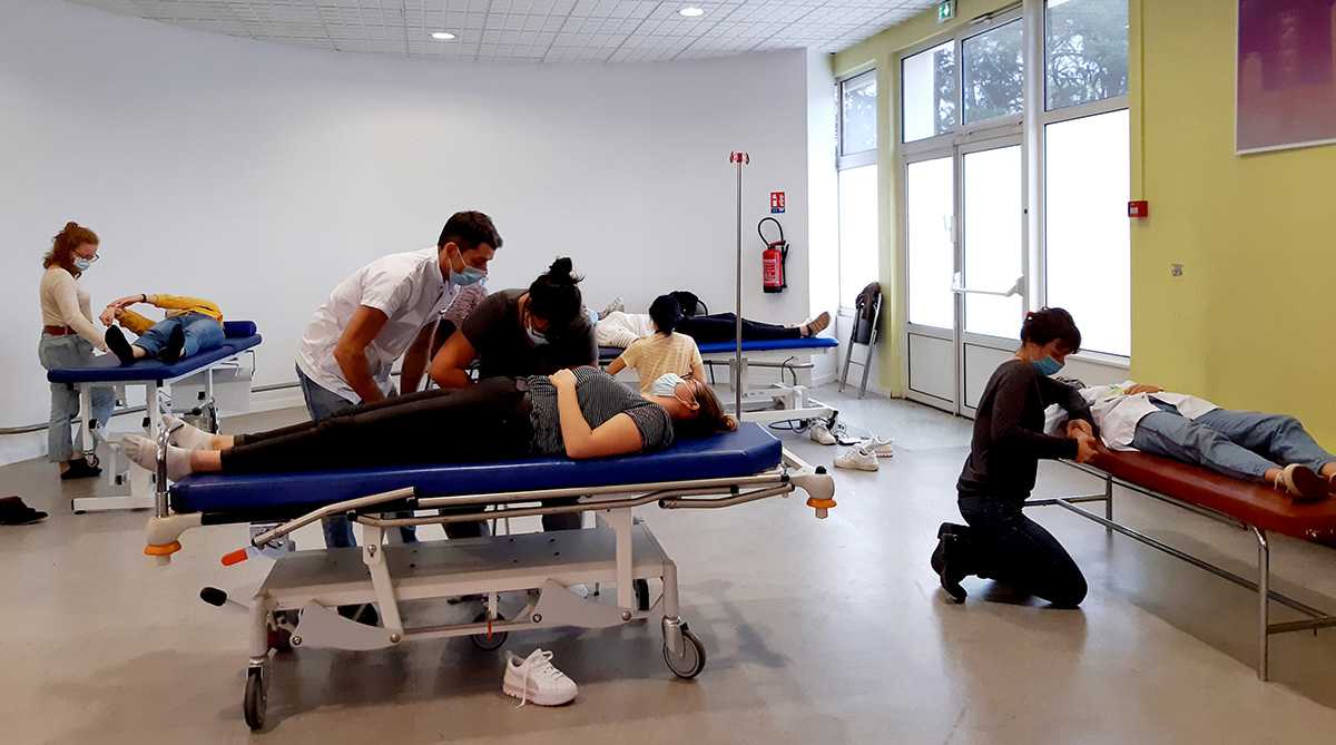 À chaque cours, l’enseignant commence par expliquer la théorie, avant de compléter par la pratique que les étudiantes appliquent ensuite. Ce lundi-là, la formation portait sur le testing musculaire ou comment pratiquer un examen permettant d’évaluer la force d’un muscle ou d’un ensemble de muscles, selon une échelle allant de 0 à 5.